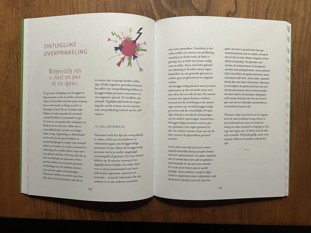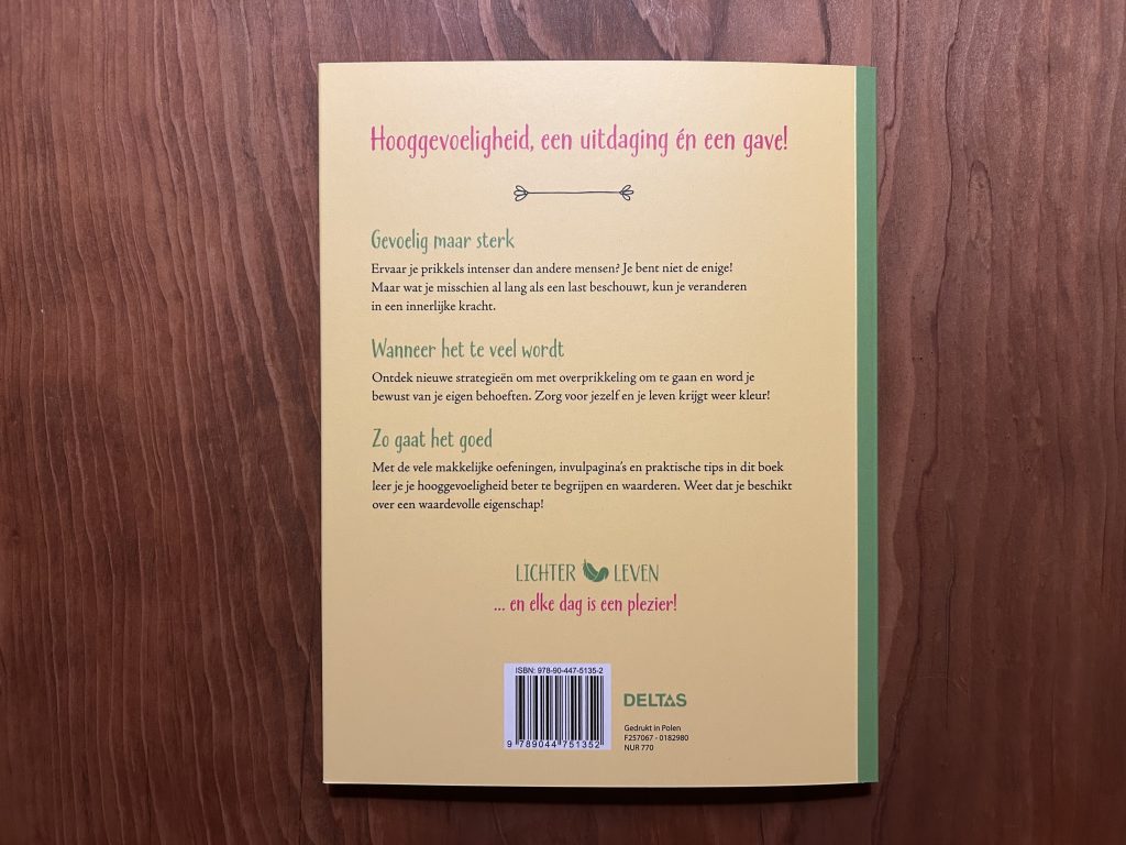 Het boek leerde me dat het niet gaat om “minder voelen”, maar om “anders voelen”. Met praktische oefeningen, invulpagina’s en concrete tips helpt het je om te ontdekken wat jij nodig hebt om goed te kunnen functioneren. Even rust, bewust ademhalen, keuzes maken in wat je toelaat. Kleine handelingen die een groot verschil maken.