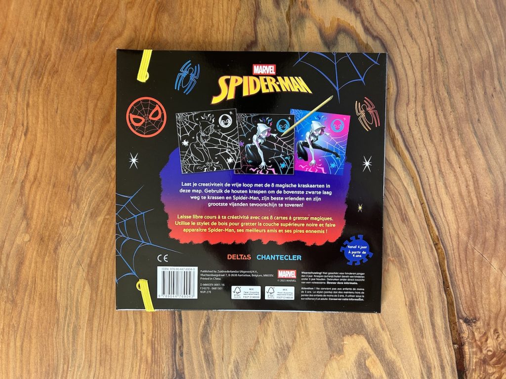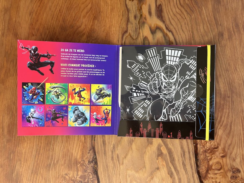Het idee is simpel en juist daarom zo leuk. Je gebruikt een houten kraspen om de zwarte laag weg te krassen. En langzaam verschijnt daar Spider-Man. Of één van zijn vrienden. Of misschien wel een vijand. Dat maakt elke pagina spannend. Je weet niet precies wat er onder zit totdat je begint. Kinderen worden nieuwsgierig en willen door. Nog een stukje. Nog een kaart. En ondertussen zijn ze geconcentreerd bezig. Zonder scherm. Zonder afleiding.
