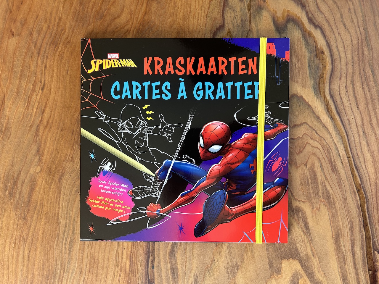 Het idee is simpel en juist daarom zo leuk. Je gebruikt een houten kraspen om de zwarte laag weg te krassen. En langzaam verschijnt daar Spider-Man. Of één van zijn vrienden. Of misschien wel een vijand. Dat maakt elke pagina spannend. Je weet niet precies wat er onder zit totdat je begint. Kinderen worden nieuwsgierig en willen door. Nog een stukje. Nog een kaart. En ondertussen zijn ze geconcentreerd bezig. Zonder scherm. Zonder afleiding.